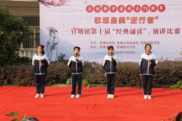 为进一步激发广大学生的民族自豪感,传承中华传统文化,丰富学生的文化生活,更好地开展学校读书活动,推动校园文化建设,培养学生对中华经典诗文的兴趣。2020年10月29日下午,凤阳县官塘镇官塘中学在该校小广场开展了“歌颂最美逆行者”为主题的朗诵比赛。
