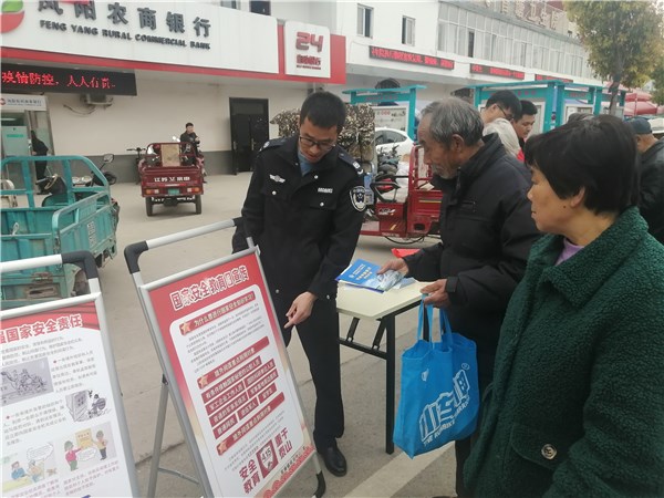 为进一步增强全民国家安全法治意识,筑牢维护国家安全的人民防线,4月14日,凤阳县官塘镇综治中心联合党政办、司法所、纪委办等部门以“坚持总体国家安全观,统筹传统安全和非传统安全,为决胜全面建成小康社会提供坚强保障”为主题,在镇南大街开展“官塘镇'4·15'全民国家安全教育日宣传活动”.