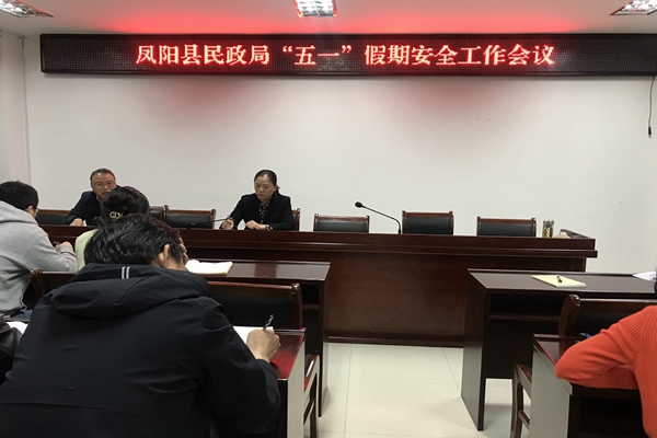 为认真贯彻落实党中央、国务院和省委、省政府以及市委、市政府关于安全生产工作部署要求,坚决稳控全县民政服务机构安全生产形势,有效防范遏制各类生产安全事故发生。4月30日,凤阳县民政局组织召开“五一”假期安全工作会议。县民政局分管领导及民政服务机构负责人参加此次会议。