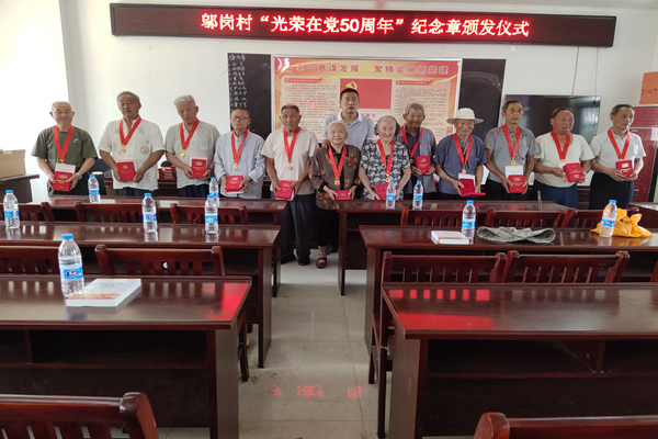 在国歌声中,邬岗村党总支书记来到老党员中间,为他们戴上“光荣在党50年”纪念章。纪念章上,红色与金色相衬,党徽、五角星、旗帜、丰碑、向日葵等在灯光下闪耀,老党员们嘴角露出笑容,用手轻轻地触摸着纪念章,脸上的皱纹里写满骄傲。