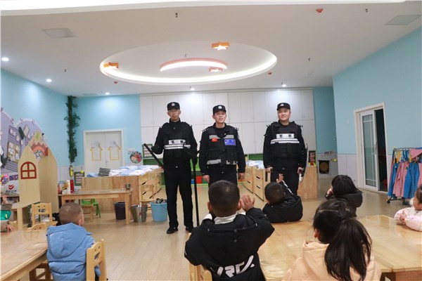 演练后,冯志强、张俊兴、孙雨、杨凯健等四位民警走进活动室,再次对师幼们进行了防暴安全常识与防暴器材的认识及器材正确使用方法的讲解,同时对幼儿园防暴应急突发事件的处置方法进行了现场指导。