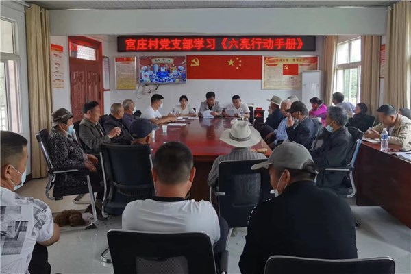 5月21日上午,宫庄村召开党员大会,党支部书记带领全体党员学习《六亮行动手册》,会后还开展了重温入党誓词活动。