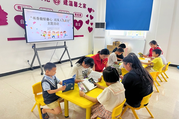 “小朋友们,今天我们一起来看书吧,大家都挑选到自己想看的书了嘛?”“挑到啦!”伴随着志愿者和孩子们的问答活动正式开始,小朋友们端坐在椅子上认真地读起书来。碰到不认识的字,小朋友轻声询问志愿者,或者几个孩子一起低声讨论。认真阅读的时间过得很快,小朋友手上的书很快便读完了,几个小朋友围坐在一起分享书中的故事。在所有儿童读完书后,志愿者邀请了一位小朋友和大家分享读后感,“我看的书是《昆虫与它的近亲》,我想分享的是麻醉大师萤火虫这一节,书上把萤火虫比作技艺高超的麻醉师,因为萤火虫在捕捉猎物前,要先给猎物打一针麻醉药,就像医生在动手术前,先给病人打麻醉针一样。等到猎物失去知觉,萤火虫就可以好好地享受猎物了。”陈欣怡小朋友开心地向大家分享了书上读到的知识。